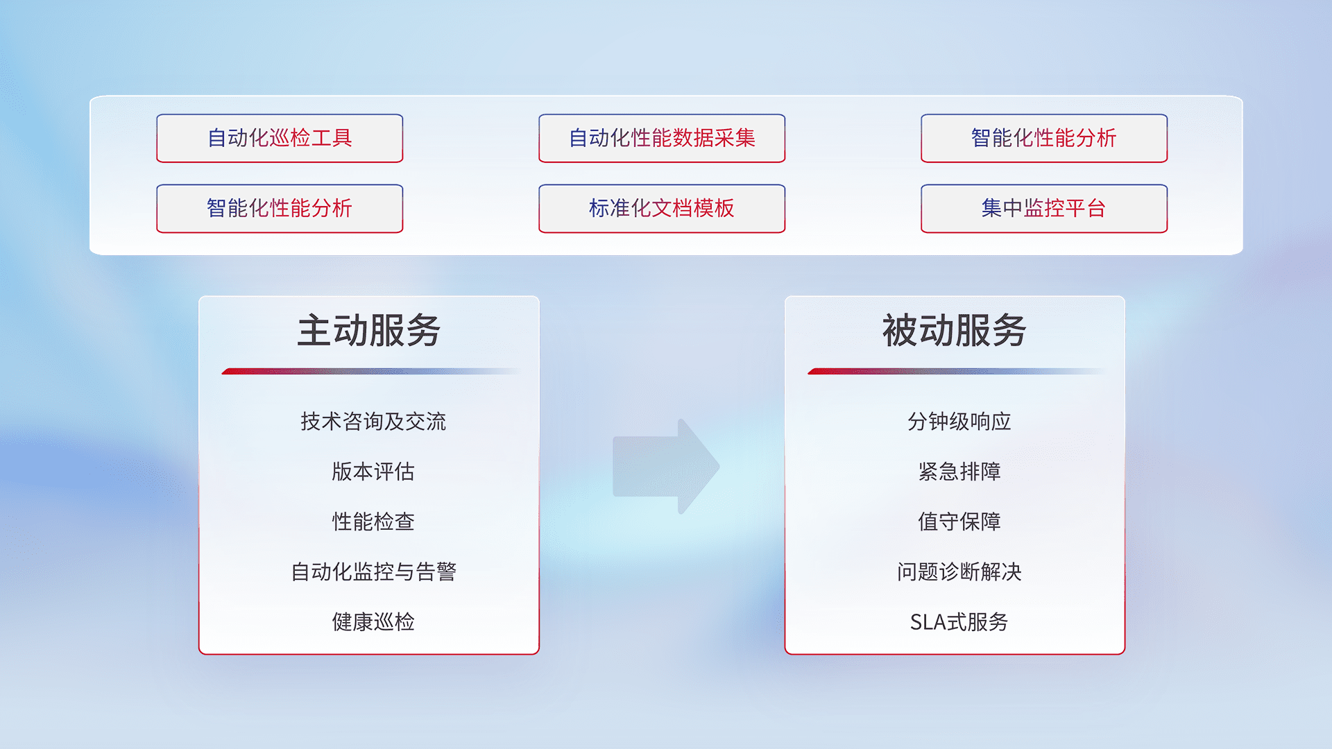 智能化工具和标准化文档,,,,保障服务质量,,,提供主动服务(包含技术咨询、、版本评估、、性能检查、、、、自动化监控与告警、、、健康巡检)和被动服务包含(分钟级响应、、、紧急排障、、值守保障、、问题诊断解决、、、、SLA服务)。。。。
