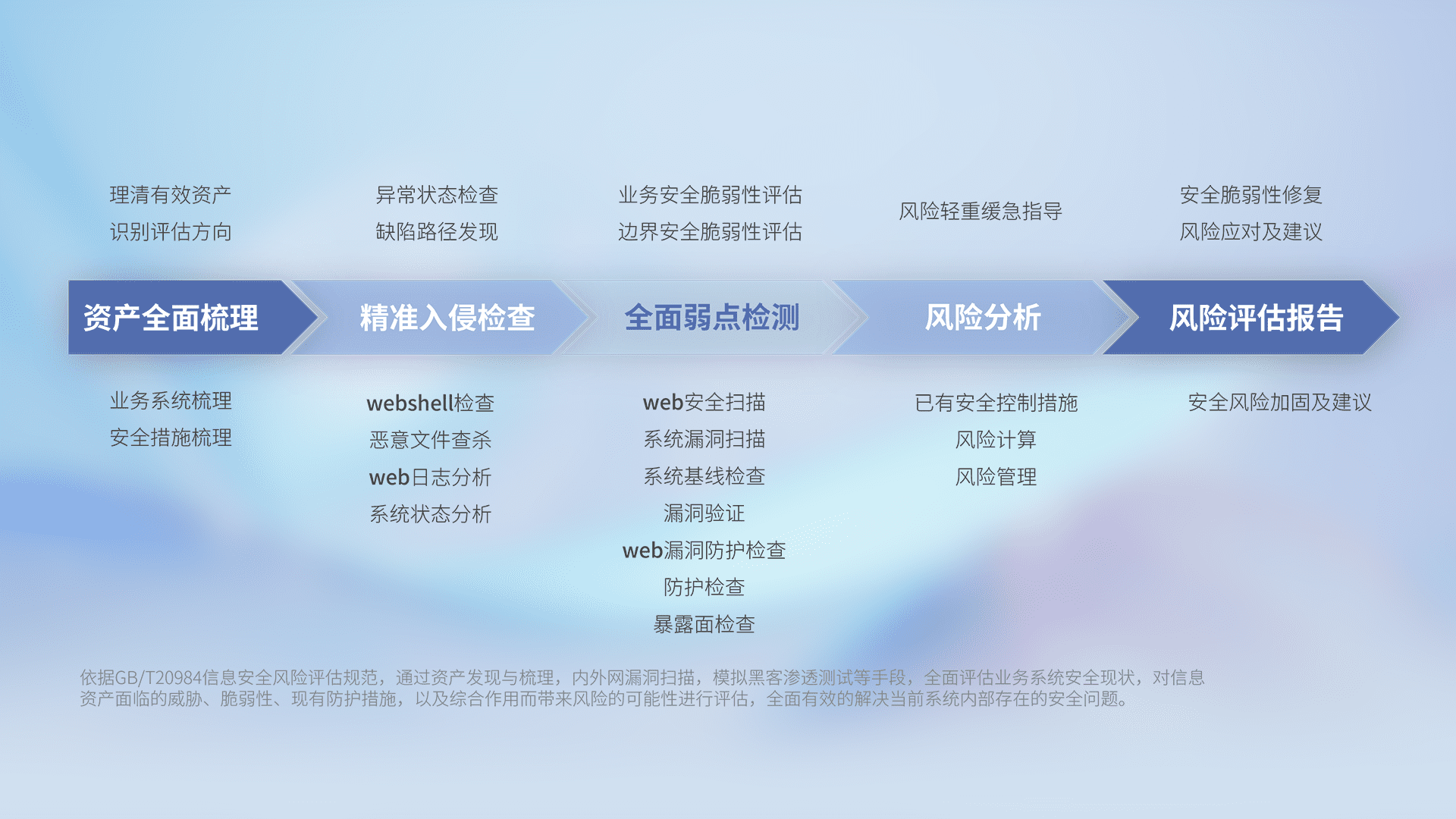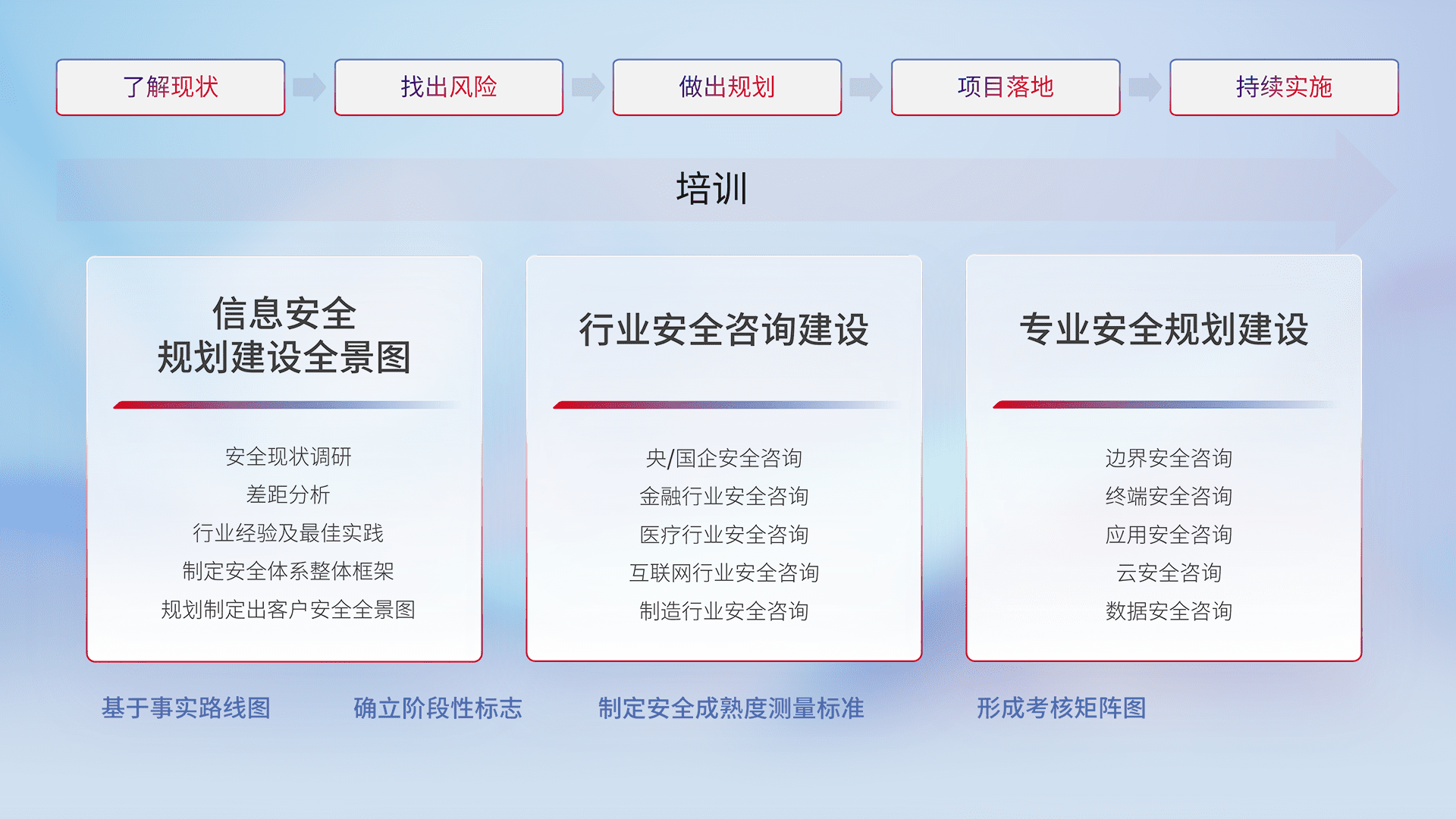 针对客户行业特性,,,以专业的安全服务+多厂商联合解决方案提供专属的一站式安全管理服务,,帮助客户全面感知网络空间威胁,,,,基于识别、、检测、、分析、、、、防护、、、监测、、、、响应的服务理论模型,,,从方案咨询、、、、集成交付、、、、评估验证、、优化加固、、、运维运营,,,,致力于为客户提供完整的闭环管理式安全服务。。。以实战经验为客户打造高抵御风险的安全体系,,帮助客户发现威胁、、对抗威胁、、、处置威胁,,,,不断积累安全对抗能力,,,持续保障数字化安全。。